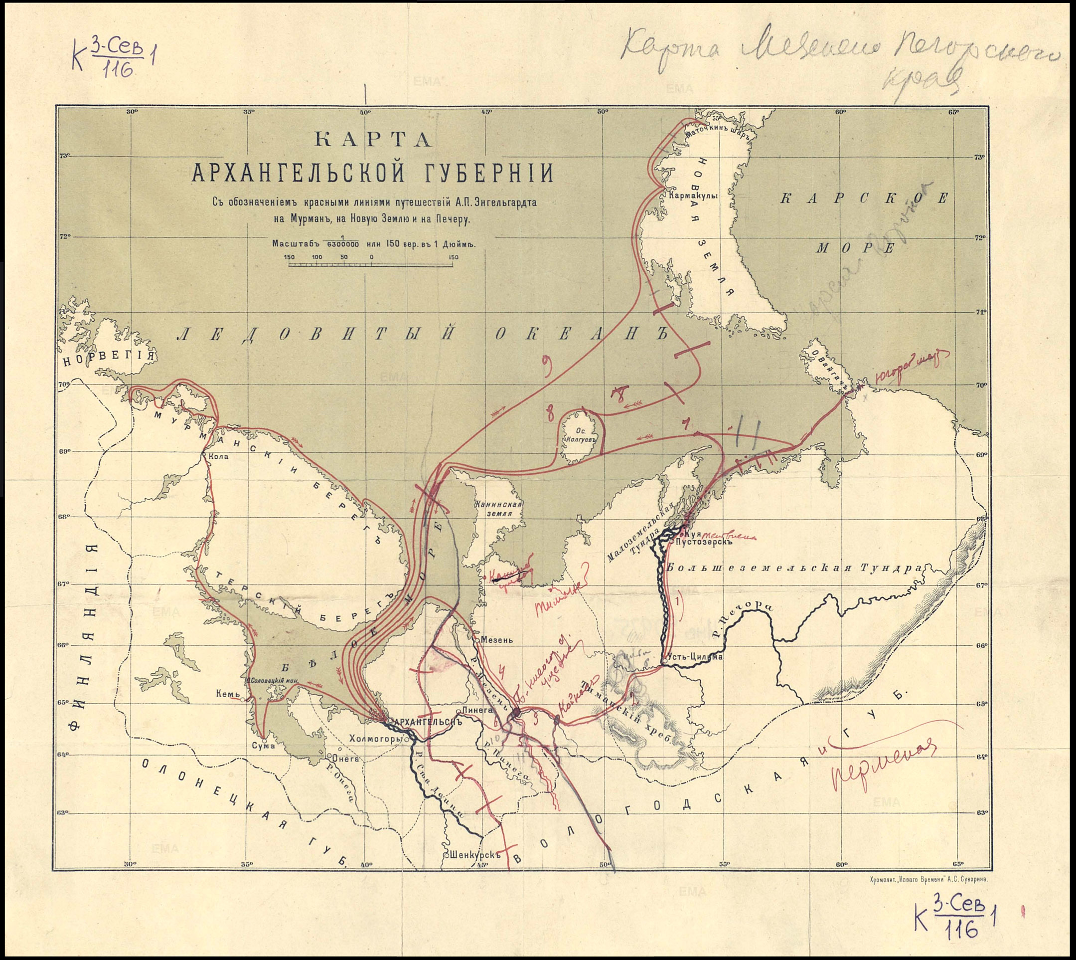 Карта Архангельской губернии с обозначением красными линиями путешествий Энгельгардта на Мурманск на Новую Землю