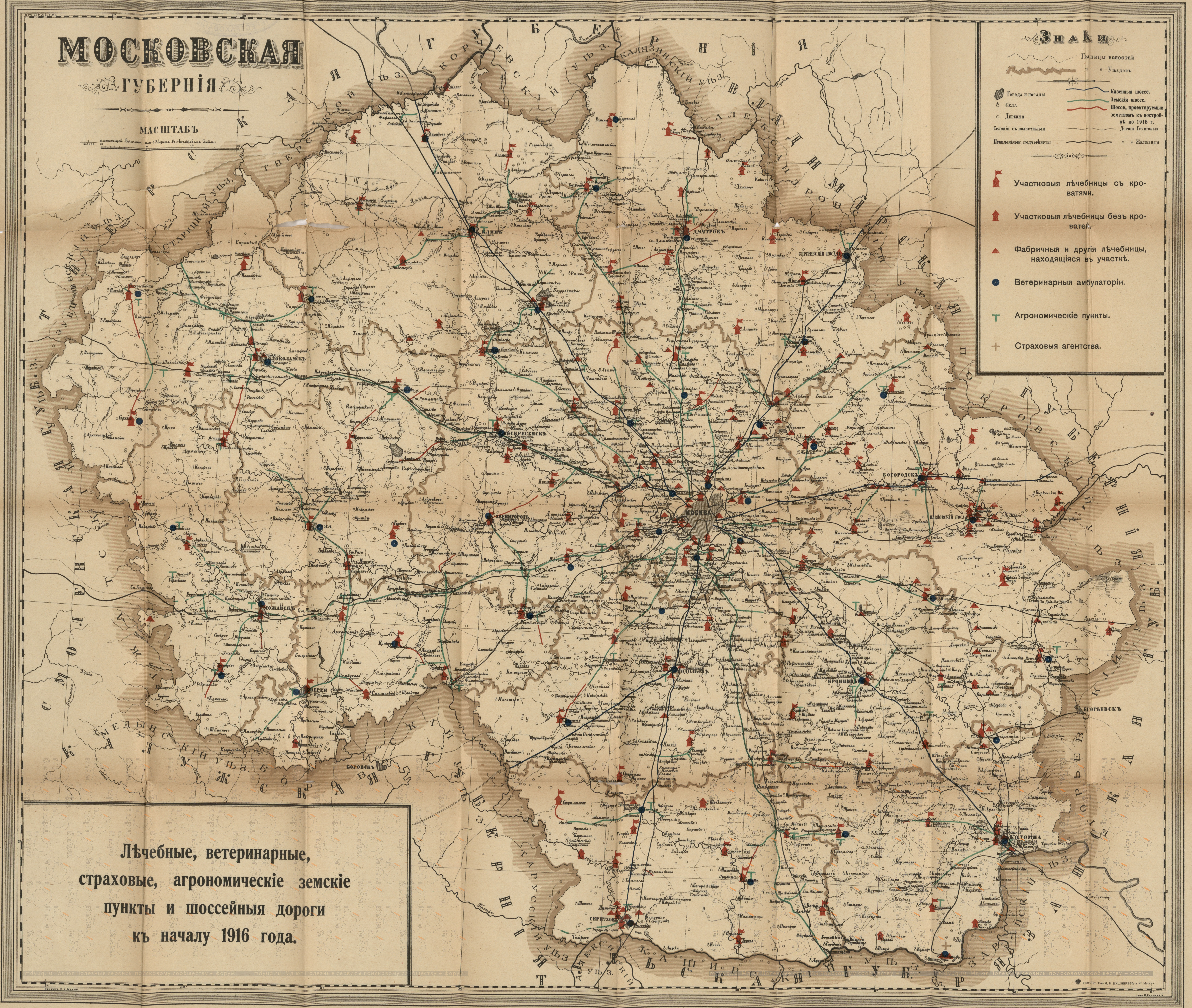 Московская губерния, агрономические, земские пункты и шоссейные дороги к началу 1916 года.