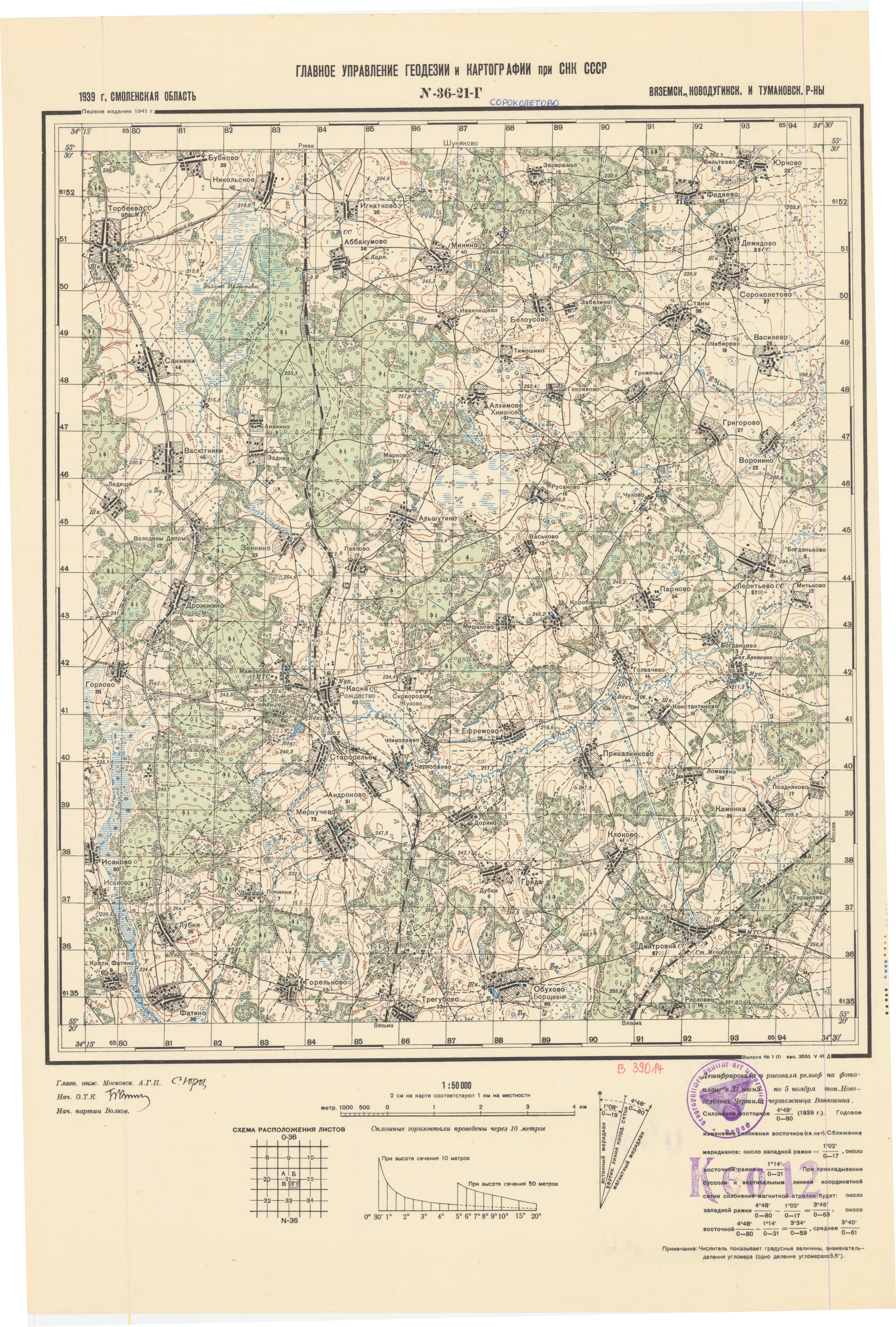 Смоленская - (N-36-21-Г) - Сороколетово - Вяземск., Новодугинск. и Тумановск. р-ны - 1939г