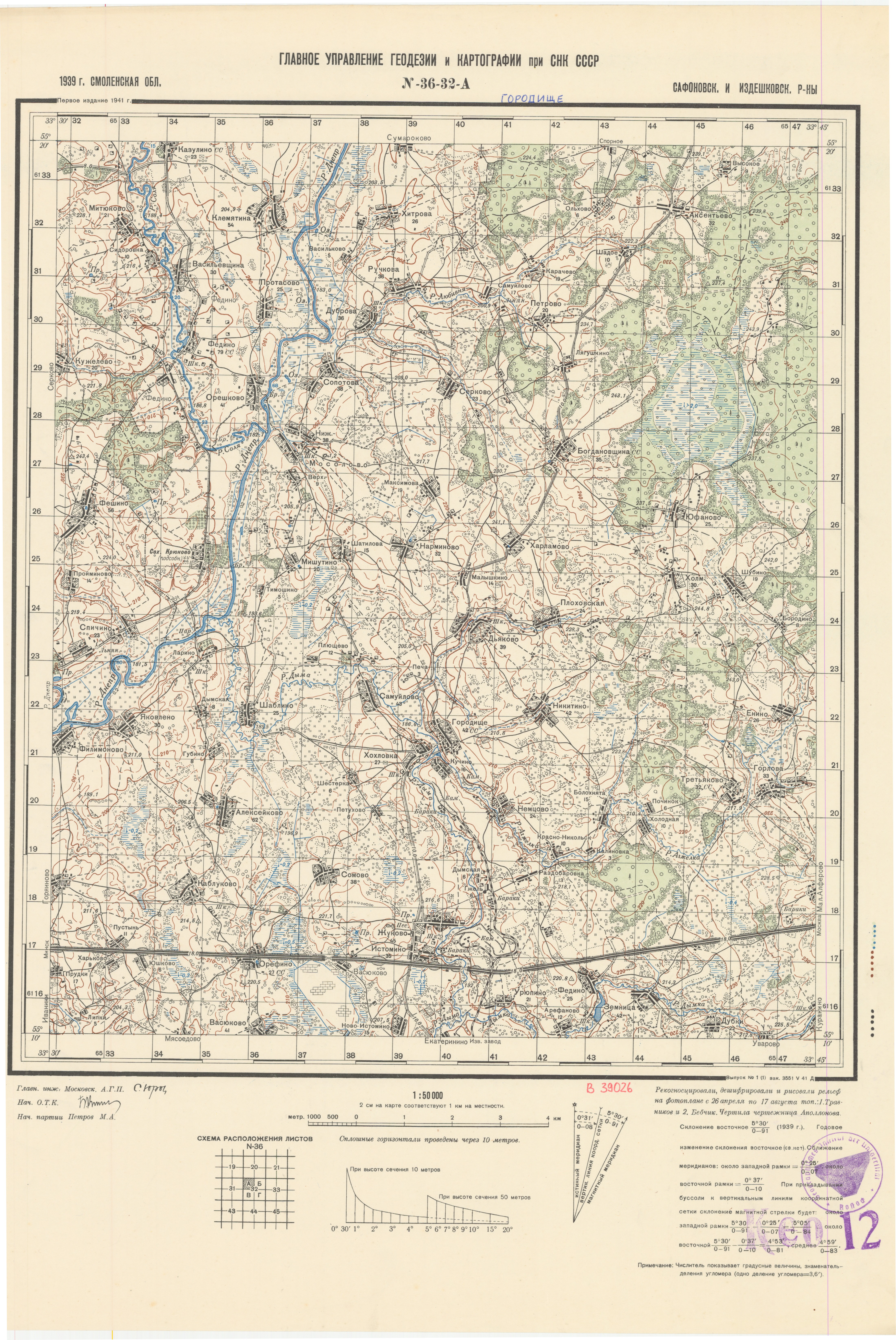 Смоленская - (N-36-32-A) - Городище - Сафоновск. и Издешковск. р-ны - 1939г